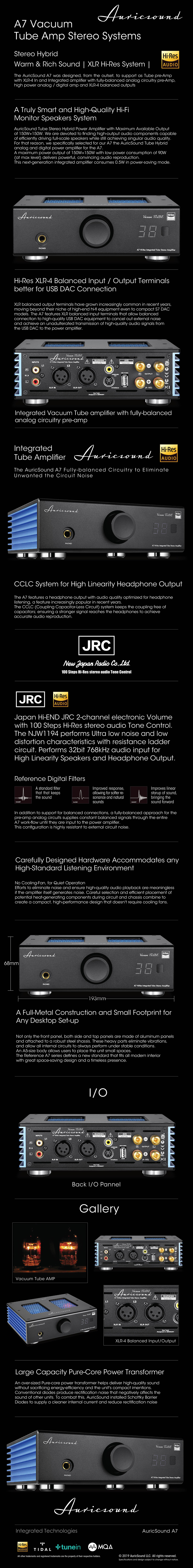 Stereo Hybrid | Warm & Rich Sound | XLR Hi-Res System The AuricSound A7 tube power amplifier has all the features to meet the needs of today’s music enthusiast while preserving the qualities that have made the A7 "EX" the most revered AuricSound tube amplifier.Employs innovative fully-digitized processing